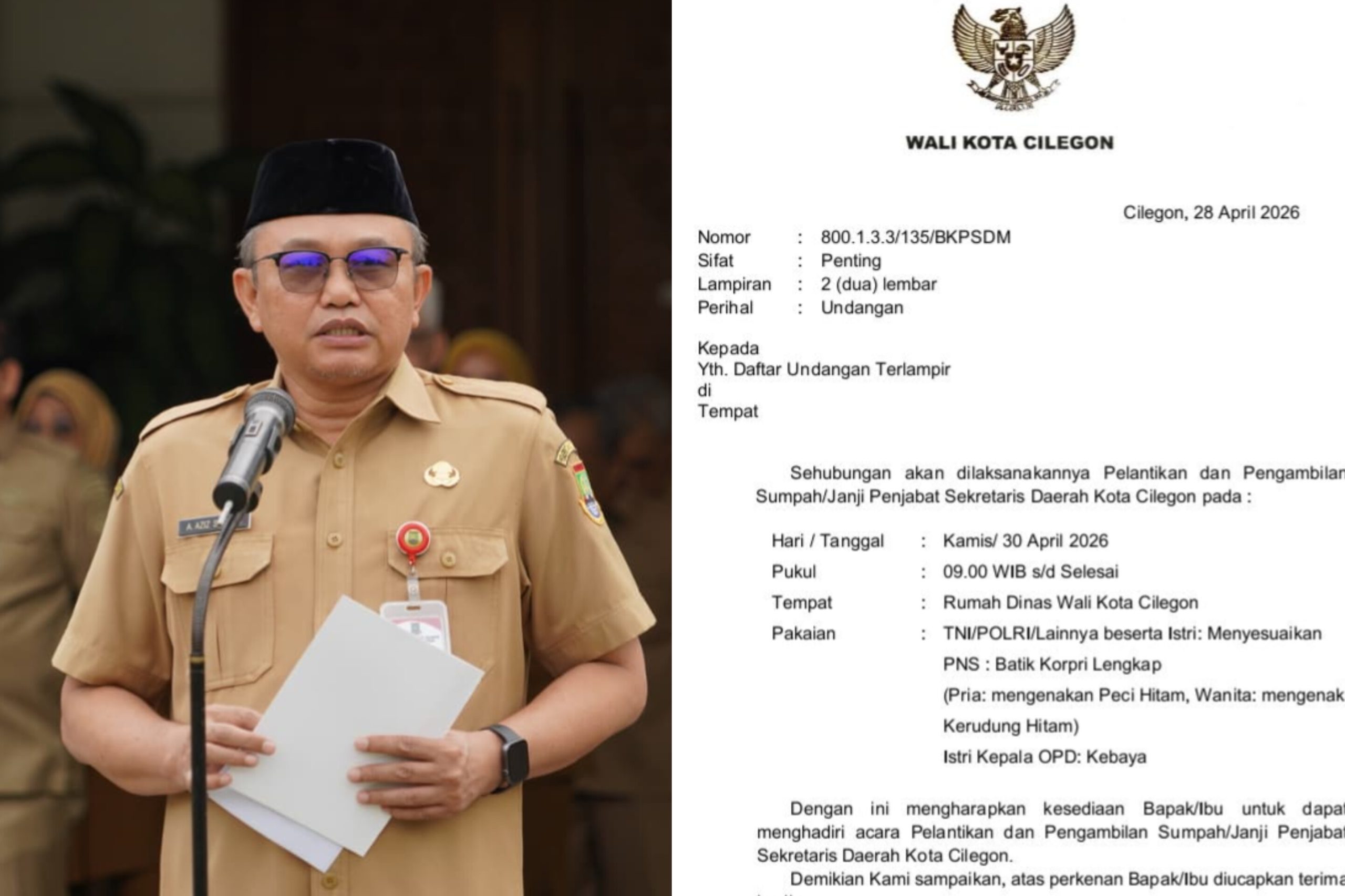 BCO.CO.ID – Aziz Setia Ade Putra yang saat ini menjabat sebagai Pelaksana Tugas (Plt) Sekretaris Daerah (Sekda) Kota Cilegon dikabarkan akan segera dilantik sebagai Penjabat (Pj) Sekretaris Daerah Kota Cilegon. Berdasarkan informasi yang dihimpun, pelantikan Aziz sebagai Pj Sekda dijadwalkan berlangsung pada Kamis, 30 April 2026. Pelantikan tersebut akan menandai perubahan status jabatan dari sebelumnya sebagai Plt menjadi penjabat Sekda sementara.